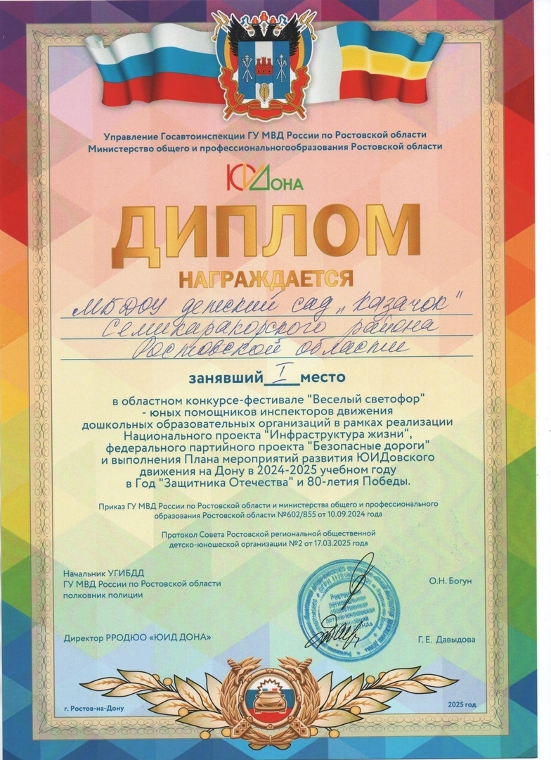 24 марта 2025 года, в станице Багаевской на базе детского сада «Радуга» прошел зональный этап областного конкурса команд ЮПИД детских садов Волгодонской зоны. В номинации «Новая игра по ПДД» лучшим стал наш детский сад. Полковник полиции в отставке Г.Е.Давыдова и с представителем Управления Госавтоинспекции ГУ МВД России по Ростовской области майор полиции Ревенко С.В. вручили диплом победителя.